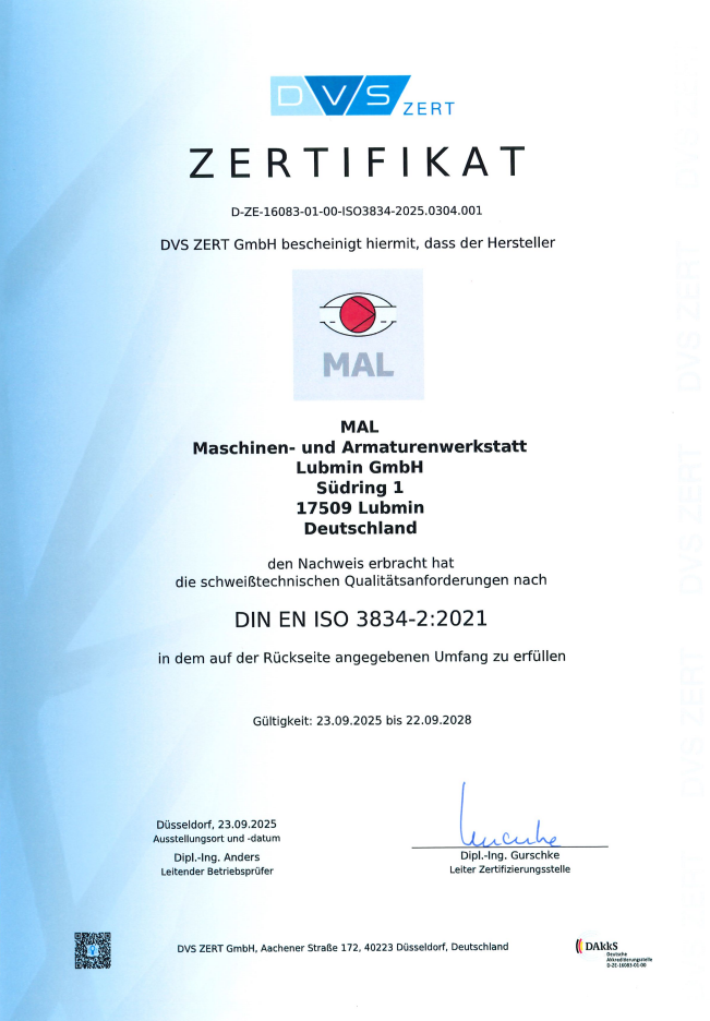 Die MAL Maschinen- und Armaturenwerkstatt Lubmin GmbH erfüllt am Standort Lubmin die hohen Anforderungen der ISO 3834-2 für umfassende Qualitätsanforderungen im Schmelzschweißen metallischer Werkstoffe. Diese Zertifizierung bestätigt die strukturierte, sicherheitsorientierte und reproduzierbare Ausführung aller schweißtechnischen Prozesse. Für unsere Kunden bedeutet dies maximale Verlässlichkeit, geprüfte Fertigungsqualität sowie dauerhaft hohe Standards in jedem Schritt der Produktion.