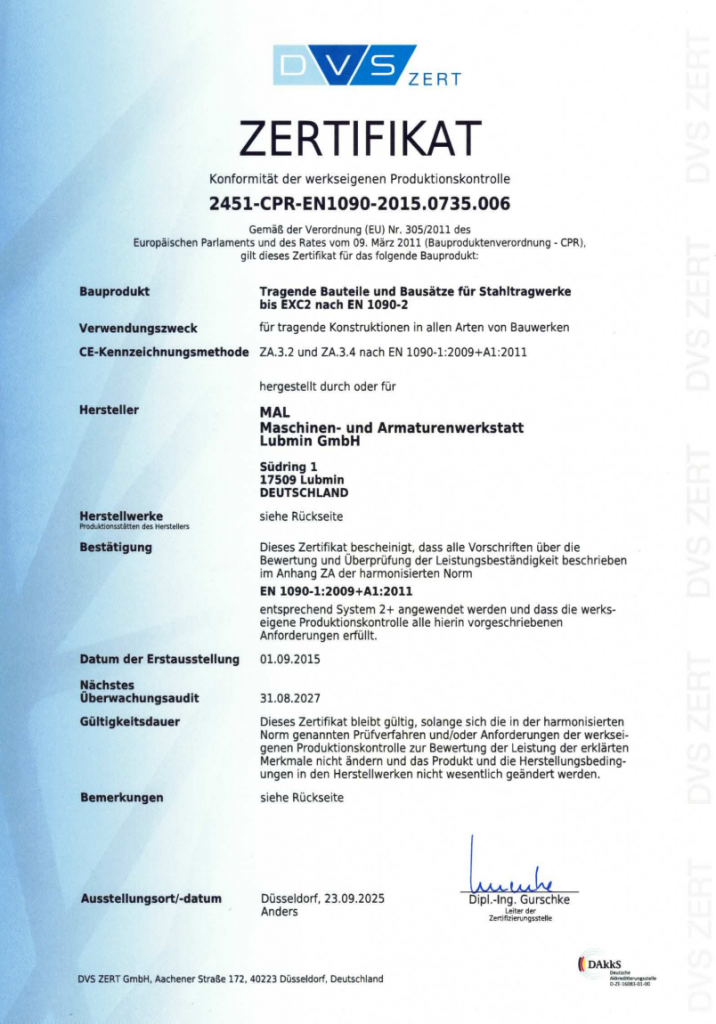 Mit der Zertifizierung nach EN 1090-2 in der Ausführungsklasse EXC 2 ist die MAL Maschinen- und Armaturenwerkstatt Lubmin GmbH befähigt, tragende Stahl- und Aluminiumbauteile gemäß europäischen Bauproduktanforderungen herzustellen. Diese Auszeichnung bestätigt unsere Fertigungskompetenz im konstruktiven Stahlbau, die kontrollierte Ausführung sicherheitsrelevanter Bauteile sowie die Einhaltung aller gesetzlich vorgeschriebenen Leistungs- und Nachweisverfahren.